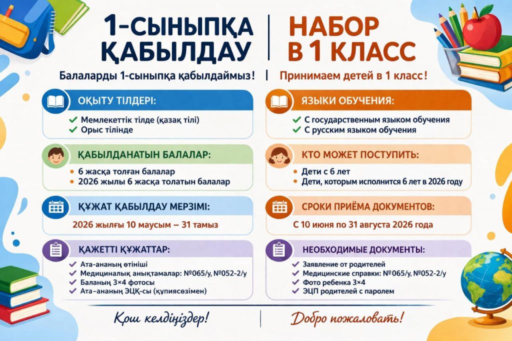 2026–2027 оқу жылына 1-сыныпқа қабылдау басталатынын хабарлаймыз!